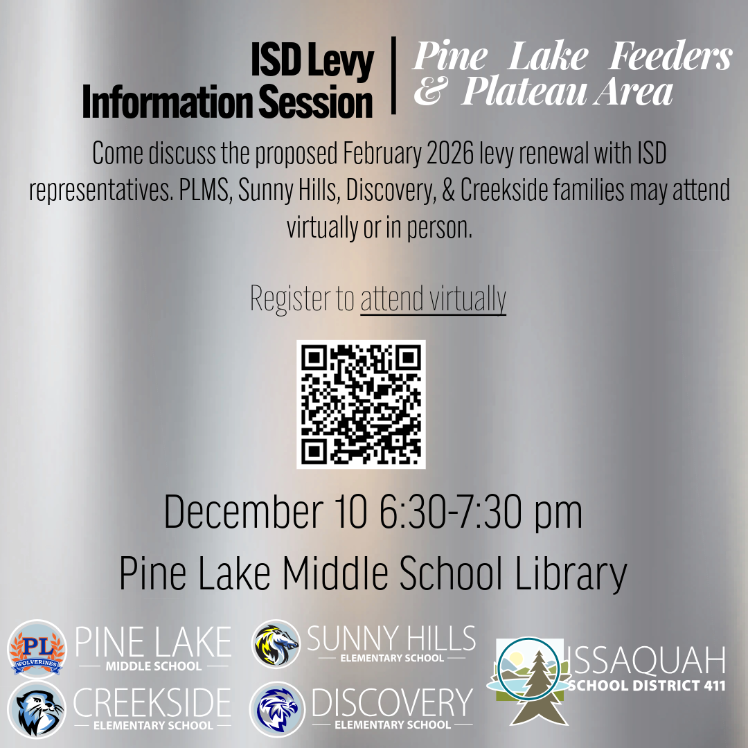 The Issaquah School District is inviting the community to attend an upcoming finance information session regarding 3 levies that will be expiring in 2026. Please join Chief of Finance and Operations, Martin Turney & Executive Director of Finance Moriah Banasick and other members of the finance team as they share facts about the district budget, how local levy dollars are used to fund gaps between what is given in funding vs. cost of education.